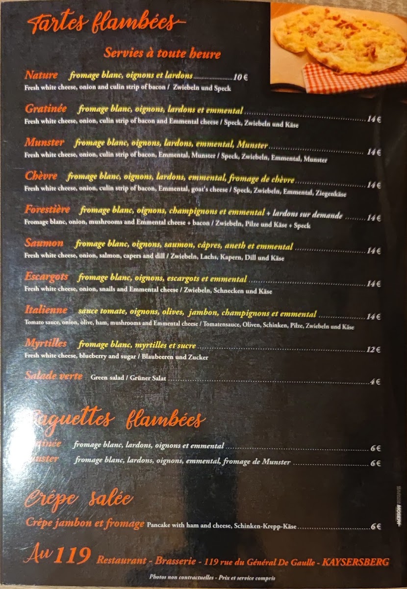 The culinary offerings at Au 119 are nothing short of impressive. The menu features local favorites, including the much-lauded tarte flambé and quiche Lorraine, both made with fresh, locally sourced ingredients. Customers have raved about the rich flavors and artistic presentation of each dish, making it a paradise for food enthusiasts. Whether you are there for a hearty meal or simply a drink, the delicious aromas wafting through the air are simply irresistible.